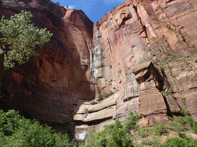 Am Endpunkt des Riverside Walk verengt sich die Schlucht und man kann abhängig vom Wasserstand des Flusses ein gutes Stück in die Schlucht (The Narrows) wandern. Das Wasser ist entsprechend kalt und glitschiger Untergrund durch runde Steine erschwert ein Vorwärtskommen. Wir ersparen uns diese Wanderung da bei den zurückkehrenden Personen auch keine so rechte Freude zu bemerken ist. Spät am Abend kehren wir am Campingplatz zurück und beschließen mit einem gegrillten Steak den Tag. Nach dem Frühstück beschließen wir den Trail über den Weeping Rock und dem Hidden Canyon Trail von ca. 3 Stunden zu machen. Steil in Serpentinen geht es einen asphaltierten Weg die senkrechte Wand hoch, über steile Abhänge erreichen wir den Aussichtspunkt der einen atemberaubenden Blick in den Zion Canyon ermöglicht. Dieser Trail sollte ein Training für den anspruchsvolleren Anstieg von Angel Landing am West Rim werden. |
